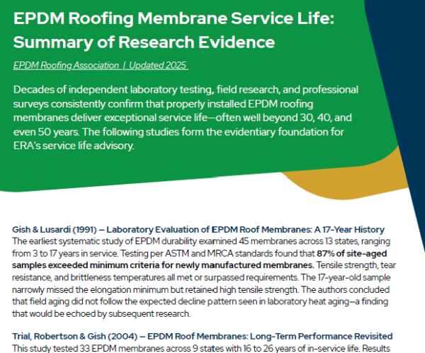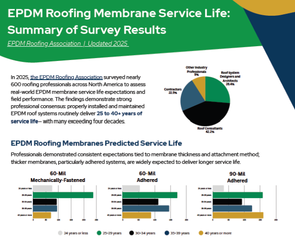 ERA’s recent service life review brings these sources together. The findings show strong alignment between field experience and published research. In ERA’s 2025 survey of 569 roofing professionals, respondents reported expected service lives ranging from about 25 years to more than 40 years depending on membrane thickness and attachment method. Many respondents also reported encountering EPDM roofs still performing at 40, 45, and even 50 years of age.